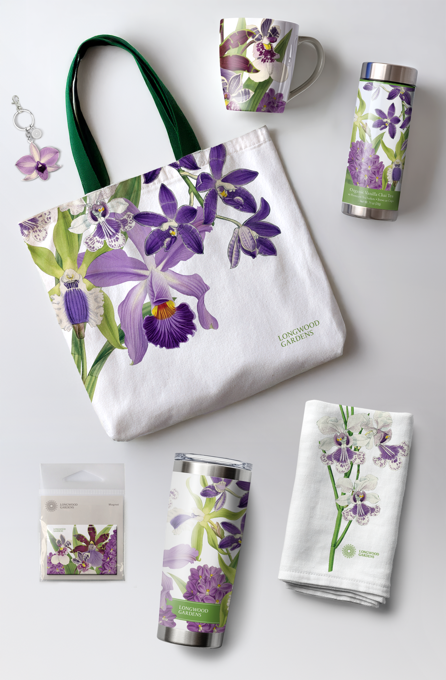 A collection of custom products was created to showcase Longwood’s vintage botanical illustrations, reimagined with a contemporary aesthetic to appeal to visitors and drive sales. Designed exclusively for Longwood, the products were developed after reviewing more than 100 archival images and carefully selecting those best suited, then preparing and refining the artwork before transforming it into layered, interwoven compositions. I then adapted the design across a full retail collection.