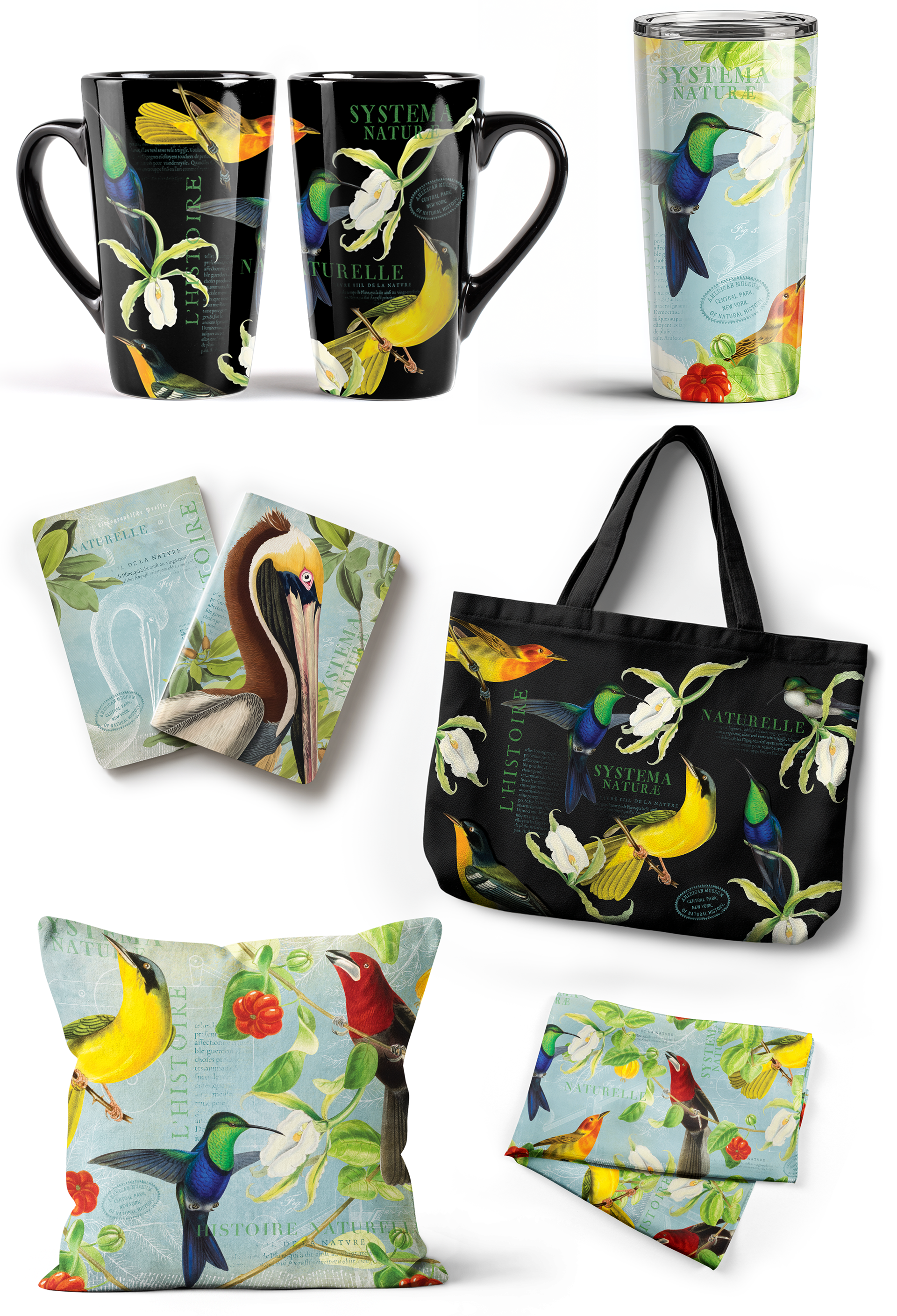 A collection of custom products was created to blend the historical richness of the museum’s vintage scientific bird illustrations from their archives with a contemporary aesthetic designed to appeal to visitors and drive sales. The process involved reviewing nearly 200 archival images, carefully selecting and preparing the artwork, and then transforming them by interweaving and layering illustrations to create entirely new compositions.