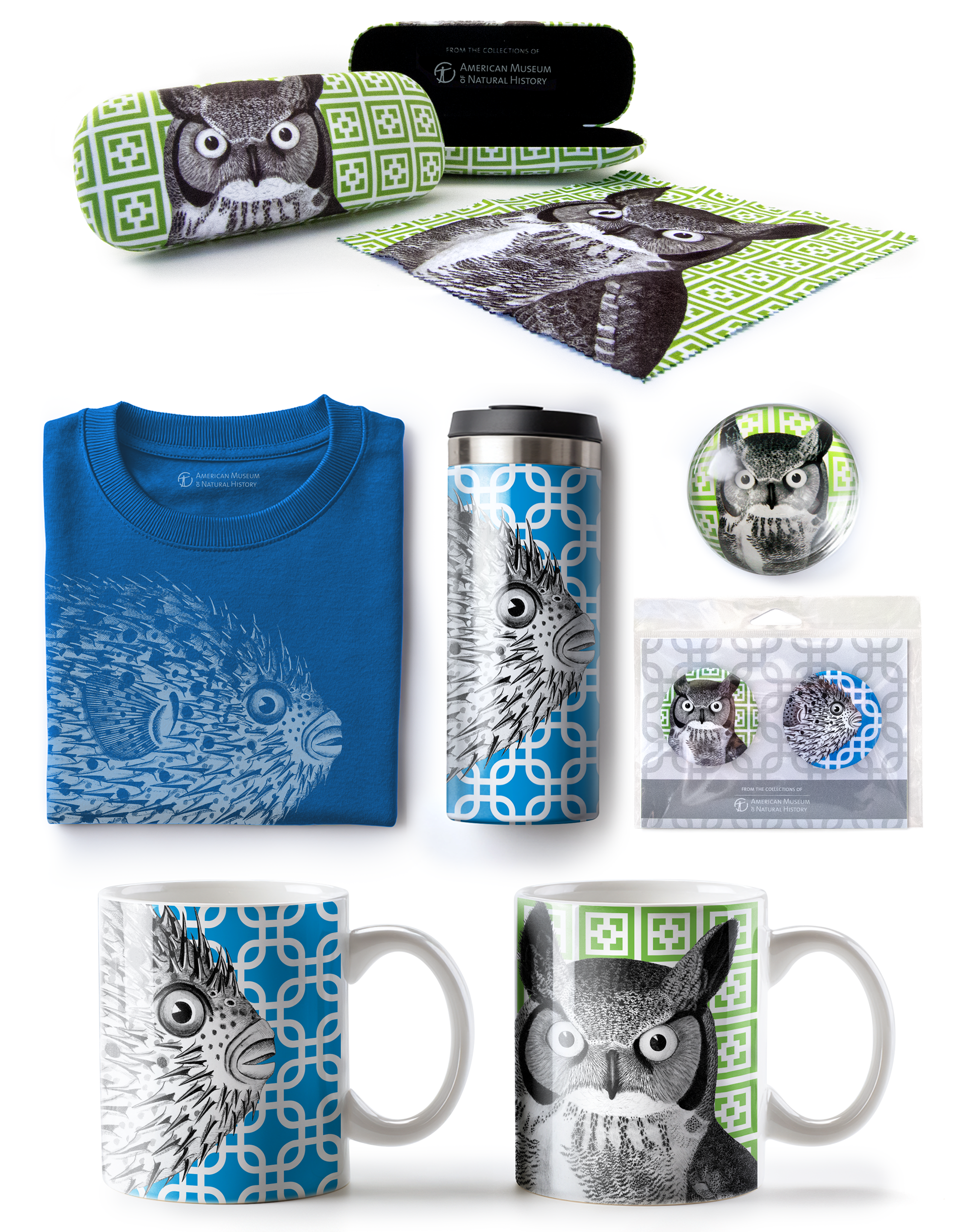 The museum’s gift shop buyers requested a custom collection combining vintage illustrations from the museum's archives with contemporary blue and green patterns that coordinated with market products they had already ordered from vendors. An owl and a pufferfish from the archives were adapted and integrated into custom patterns created for the product collection.