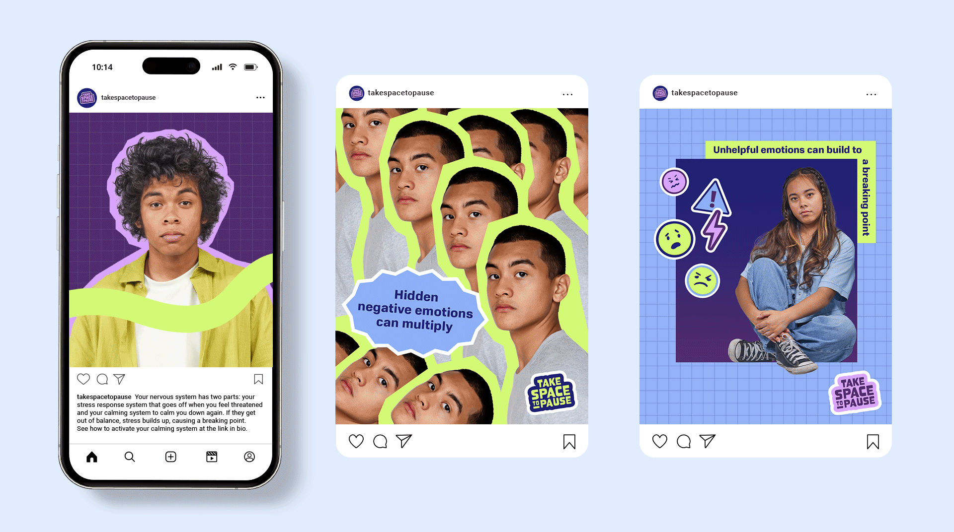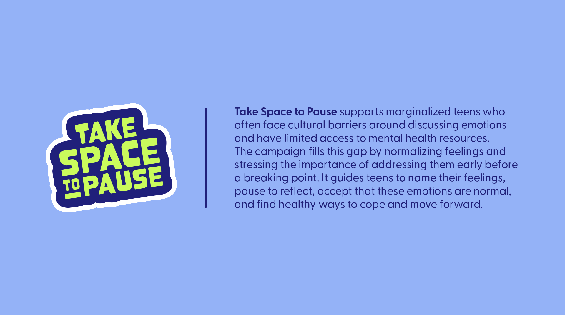 Take Space to Pause is a social impact behavior-change campaign created for the California Department of Public Health to help underserved teens—including Black and African American, Latino, Asian and Pacific Islander, American Indian and Alaska Native, LGBTQ+, foster youth, and those in rural areas—learn how to recognize signs of stress and build coping skills before becoming overwhelmed and reaching a breaking point.