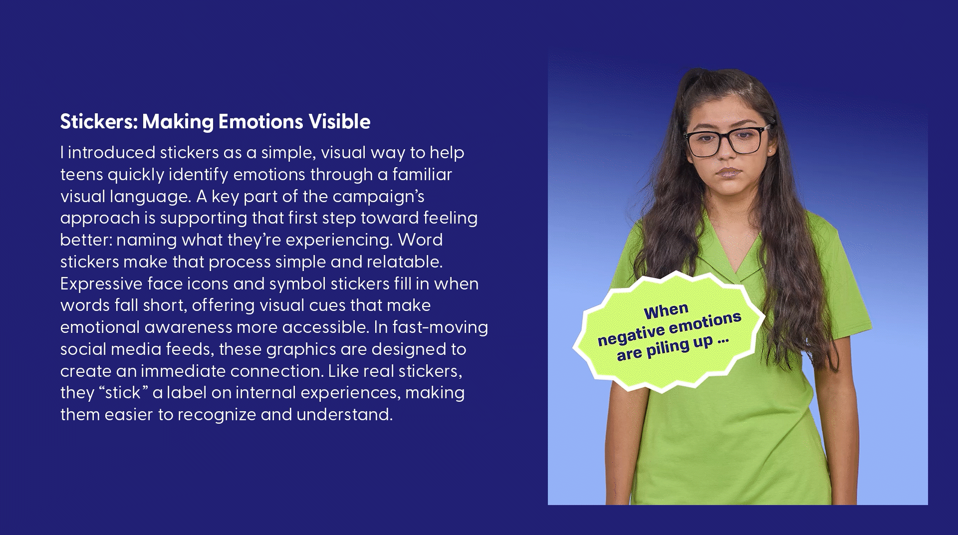 As Associate Creative Director for this project, I ideated and designed the branding and core visual identity for the campaign, drawing from extensive research and behavioral insights to thoughtfully translate complex ideas into a clear and meaningful visual system. After establishing these foundational designs, I collaborated closely with a large multidisciplinary team, including project leaders, art directors, copywriters, researchers, illustrators, animators, production team, and editors, to further develop and refine the brand. Together, we combined our diverse expertise and perspectives to expand and evolve the initial concepts into a cohesive, authentic, and visually compelling campaign designed to resonate with our priority teenage demographic.